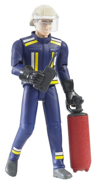 – likeable character with an impression that is as realistic as possible – just like the real thing – the credo of the Pro series is the standard here as well.The fireman is immediately ready for use thanks to his protective clothing and equipment consisting of uniform, helmet with visor and gloves. He always has a fire extinguisher with him that he can use quickly to prevent a fire from spreading. If the fireman can’t deal with the blaze himself, then he can call for backup on his radio. BRUDER Spielwaren has various vehicles and extras to be able to recreate a big fire brigade procedure.