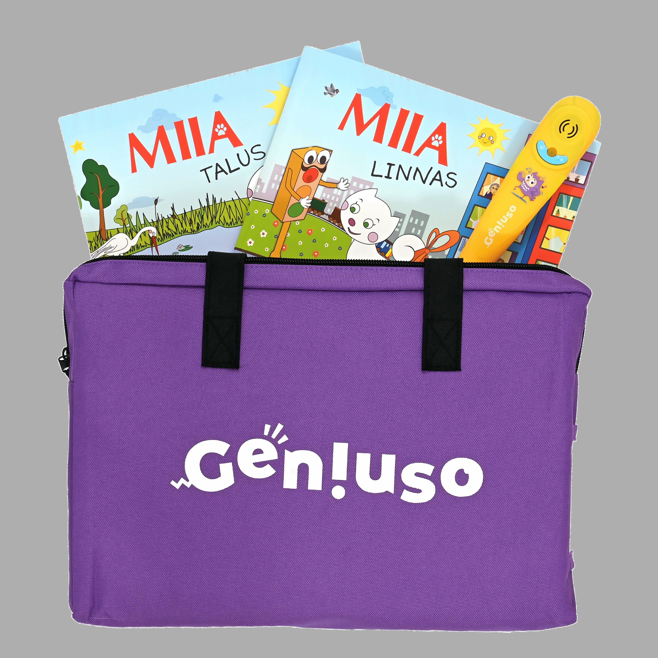 Geniuso MIIA põhikomplekt: pliiats, rääkivad raamatud ”Talus” ja ”Linnas” ning kandekott