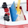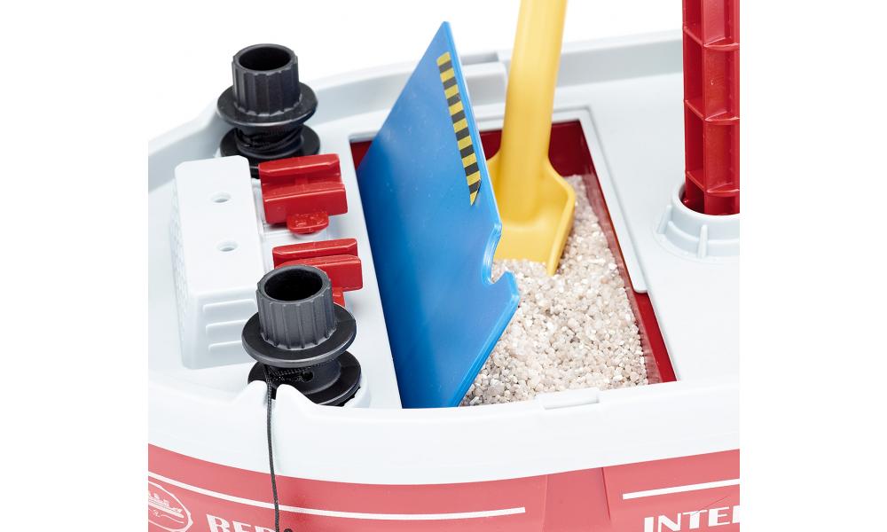 The new container ship extends the play world with the theme of ports. The ocean giants cross the world’s oceans and safely transport the freight to the destination port in the SIKUWORLD. The floating container ship is moored in the port using the two mechanical anchor winches. Just like the huge prototypes, the two bunkers in the ship’s hold can be loaded with bulk material (granulate or sand) or with the two containers. But in addition, cars and trucks can also be carried on the deck of the container ship. For this, the vehicles can enter the two bunkers via the stern. The containers can be moved up or down using the rotating crane and the mobile trolley, which has a special gripper. Naturally, these match the 1:50 scale semi-trailers from SIKU which are waiting on the quayside. The shovel provided can be used for unloading.